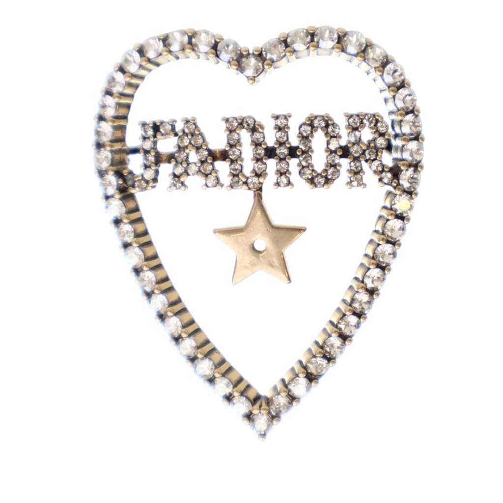 This brooch features a gold tone metal body with rhinestone embellishments, and a back pin closure.
