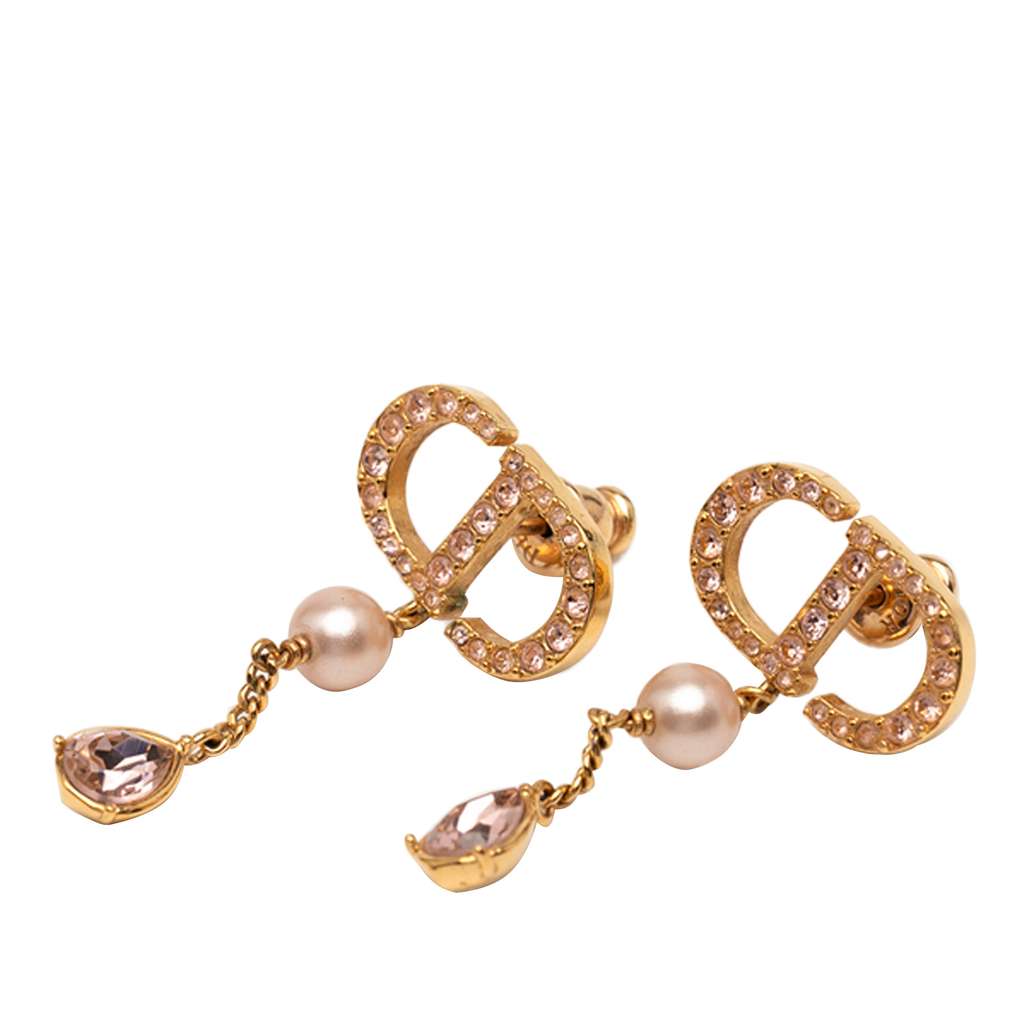 These earrings feature a gold-tone metal body with faux pearl and rhinestone embellishments, and push back closures.