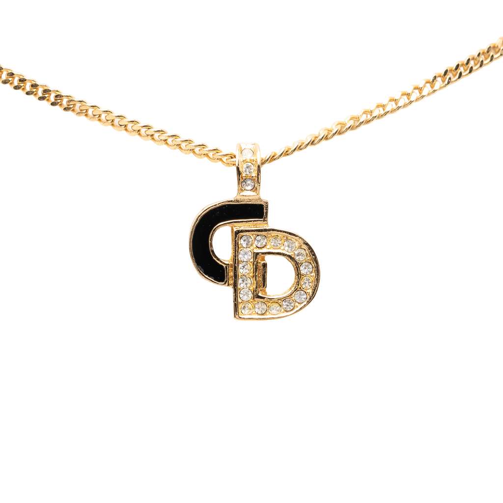 Dior Gold Plated Rhinestone CD Pendant Necklace Gold Metal