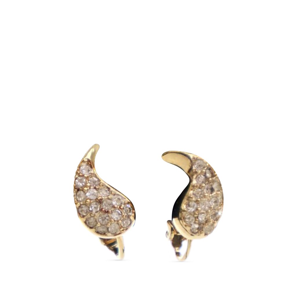 These earrings feature a gold plated body with rhinestone details, and a back clip on closure.