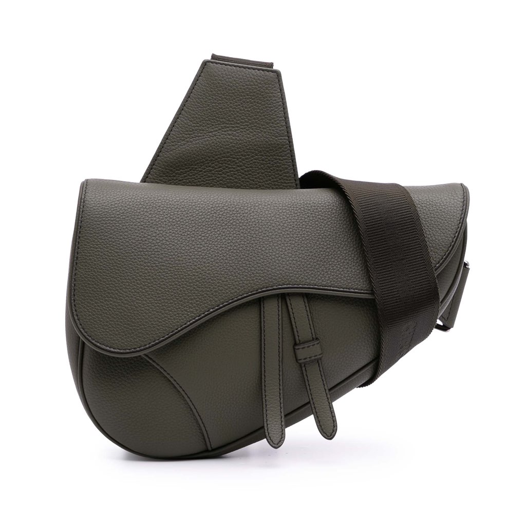 The Saddle features a leather body, a flat canvas shoulder strap, a front flap, and a top zip closure.