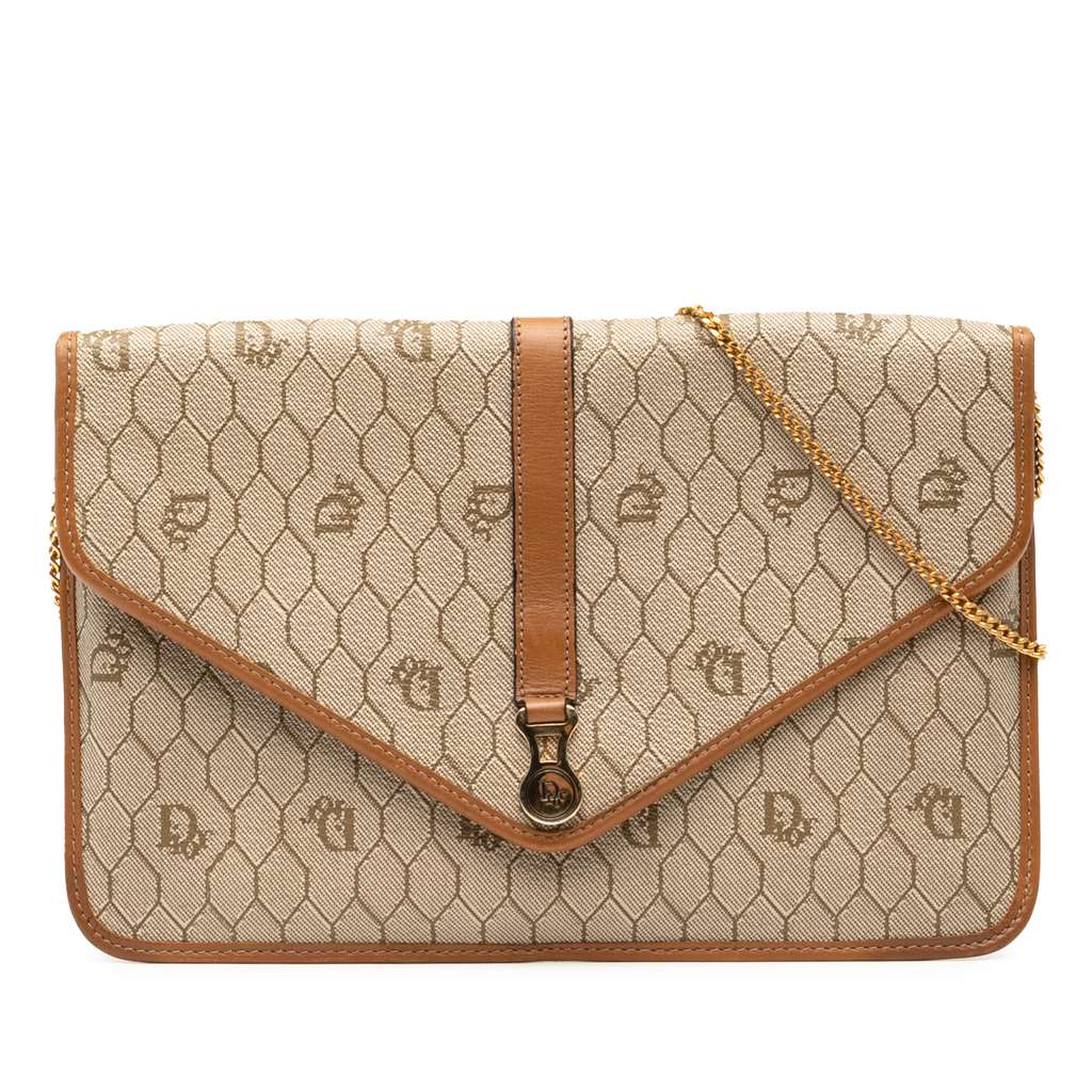 This crossbody bag features a coated canvas body with leather trim, a chain shoulder strap, and a front flap with magnetic snap closure.