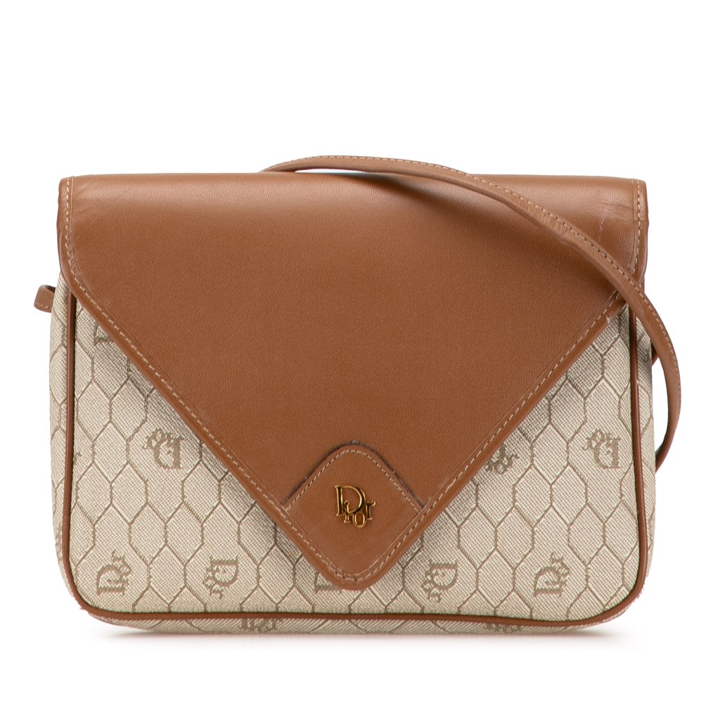 This crossbody bag features a coated canvas body with leather trim, a flat leather strap, a top flap with magnetic snap button closure, and an exterior zip pocket.