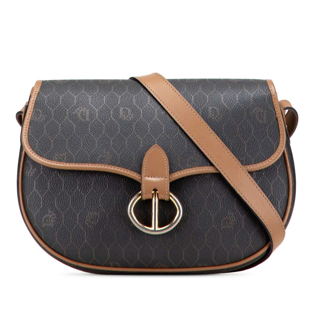 This crossbody bag features a coated canvas body with leather trim, an adjustable flat leather strap, a top flap with magnetic closure, and an interior zip pocket.