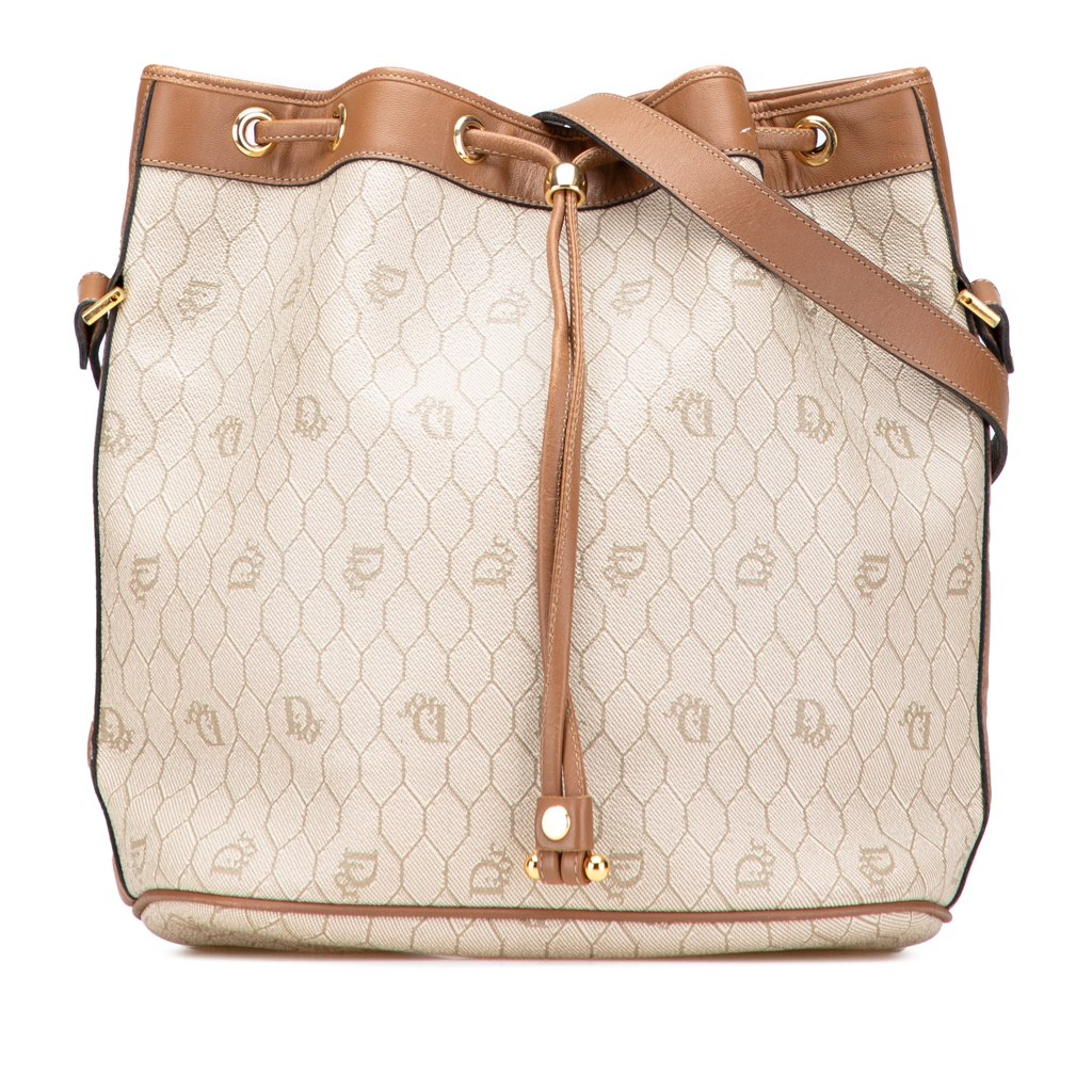 This bucket bag features a coated canvas body with leather trim, an adjustable flat leather shoulder strap, an open top with a drawstring closure, and a pouch inclusion.
