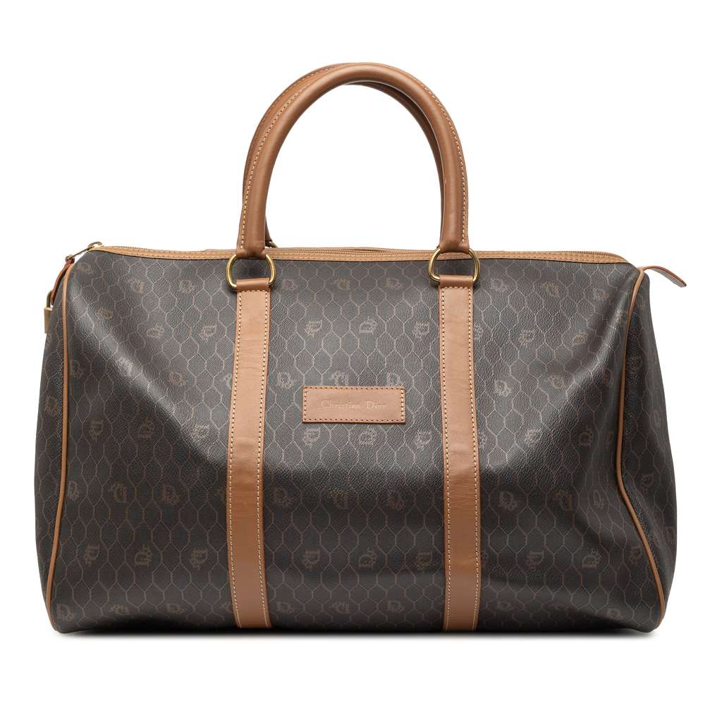 This travel bag features a coated canvas body with leather trim, rolled leather handles, a top zip closure, and an interior zip pocket.