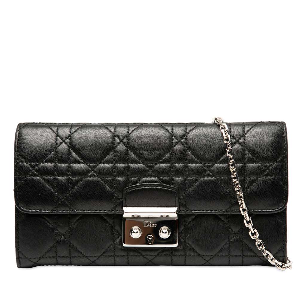The Miss Dior Promenade wallet on chain features a quilted leather body, a detachable chain link strap, a front flap with push lock closure, and interior zip and slip pockets.