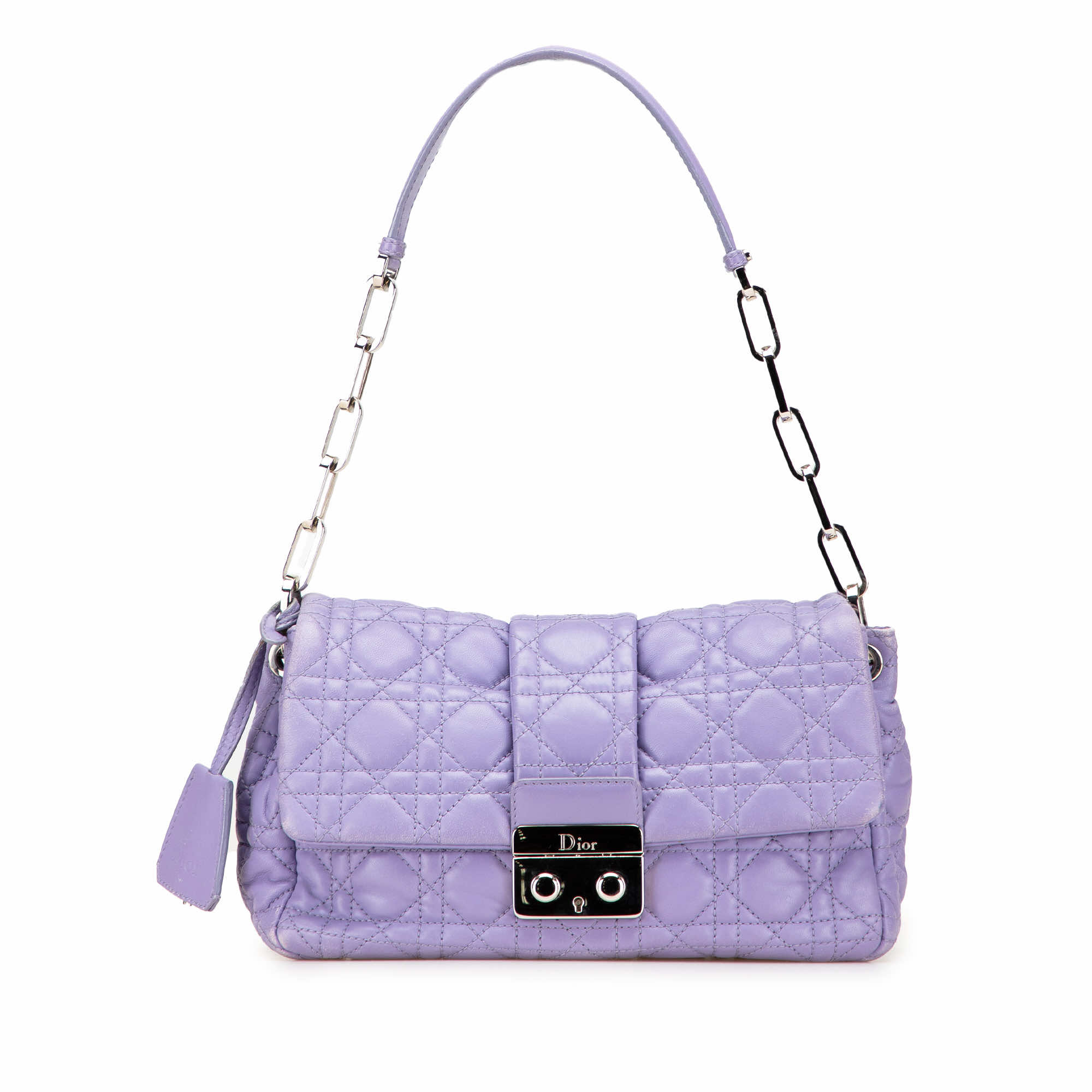 The New Lock Flap features a quilted lambskin leather body, a chain link strap with leather guard, a front flap with a push lock closure, interior slip compartments, and an interior zip pocket.