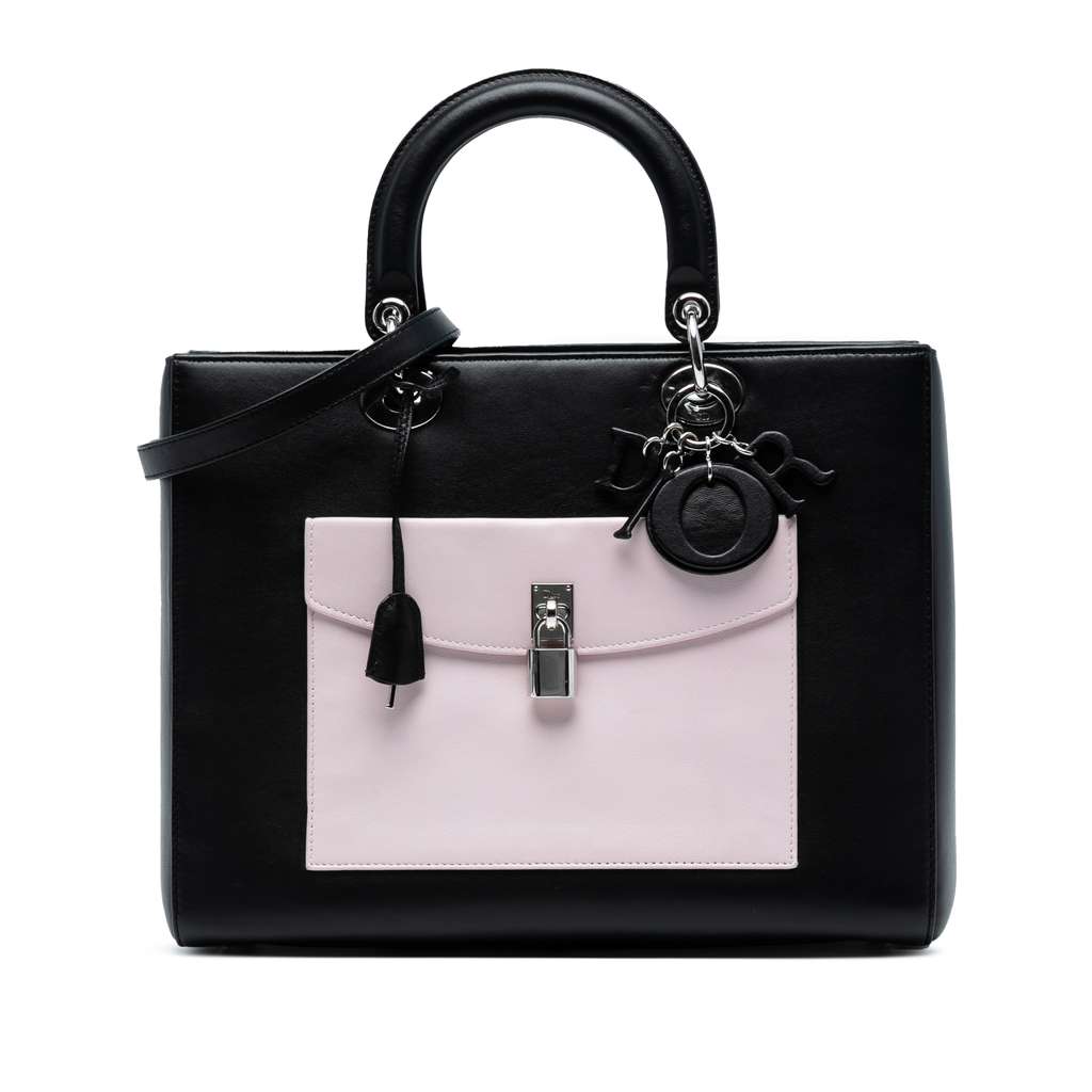 The Lady Dior features a leather body, flat leather top handles, a detachable flat leather shoulder strap, a top zip closure, exterior front and back flap pockets, and an interior zip pocket.