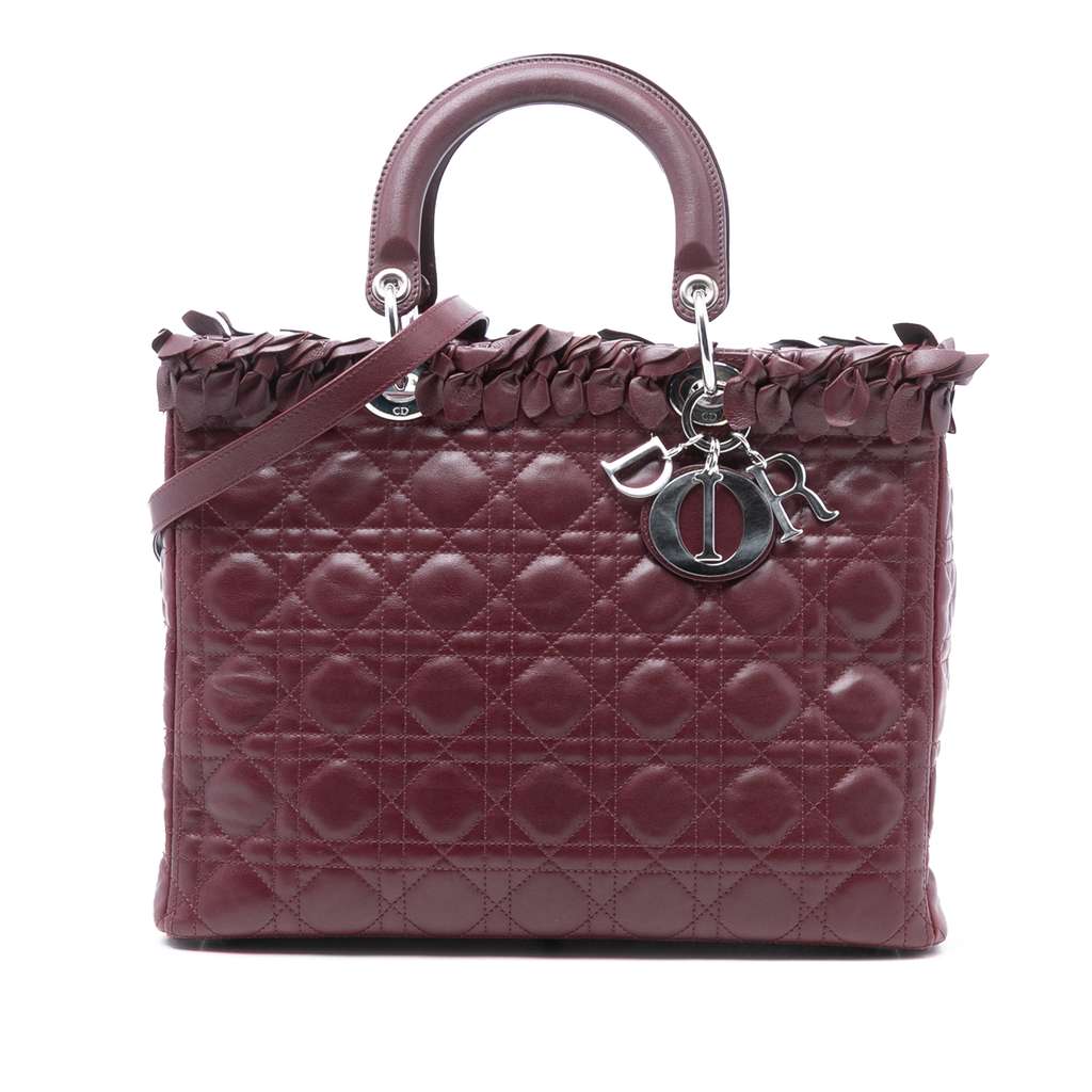 The Lady Dior features a quilted leather body with top bow details, rolled top handles, a detachable flat leather strap, a top zip closure, and an interior zip pocket.