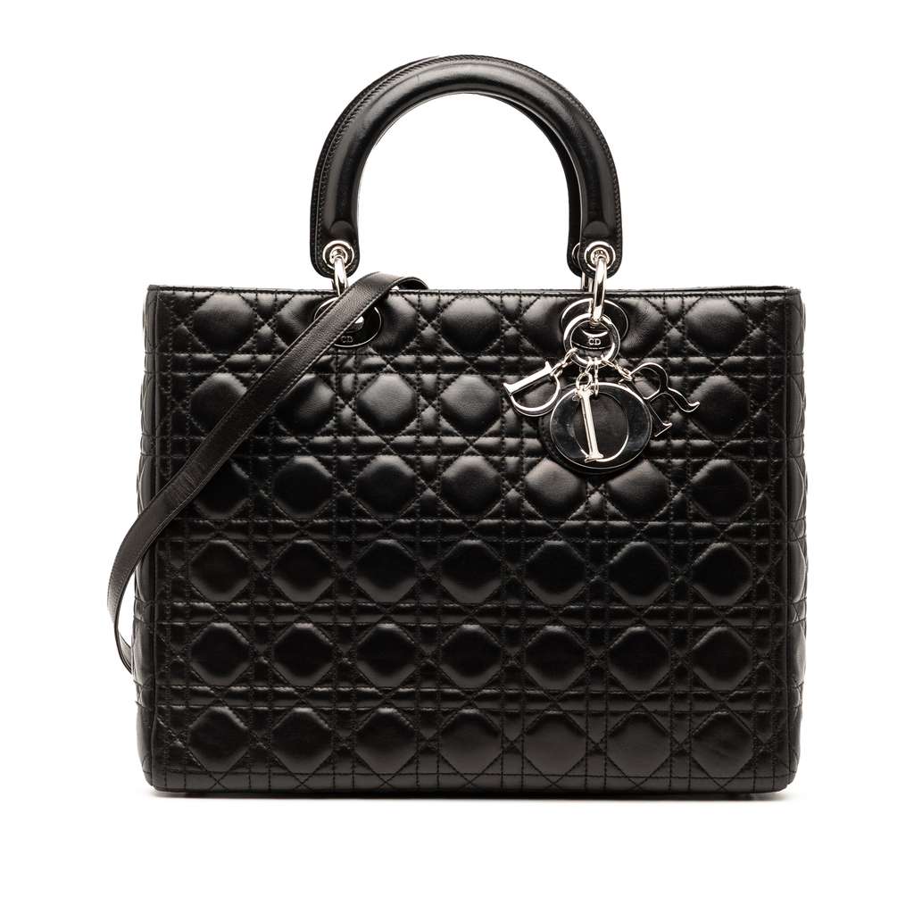 The Lady Dior features a quilted lambskin leather body, silver tone hardware, flat top handles, a detachable flat leather strap, a top zip closure, and an interior zip pocket.