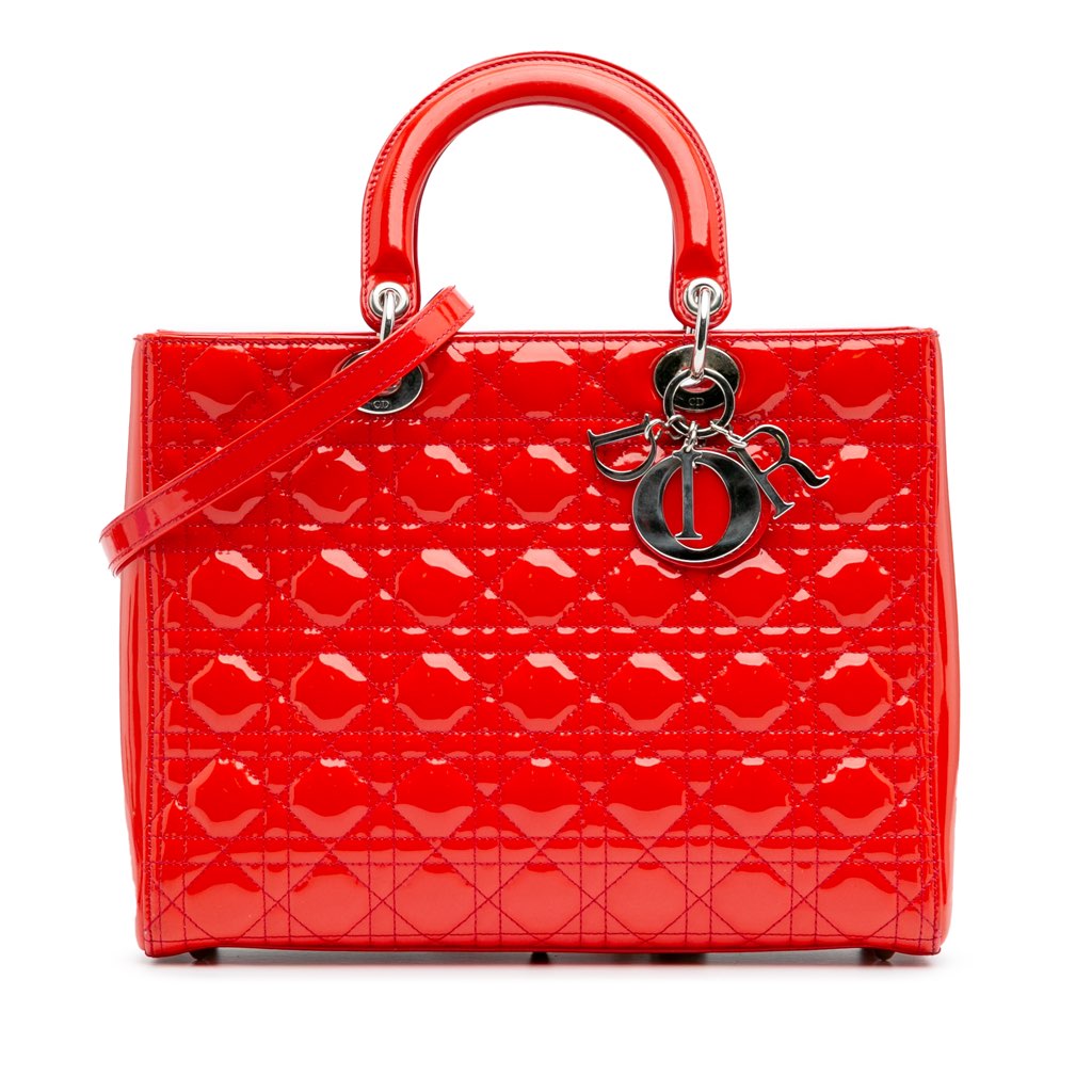 The Lady Dior features a patent leather body, flat leather top handles, a detachable flat leather strap, a top zip closure, and an interior zip pocket.