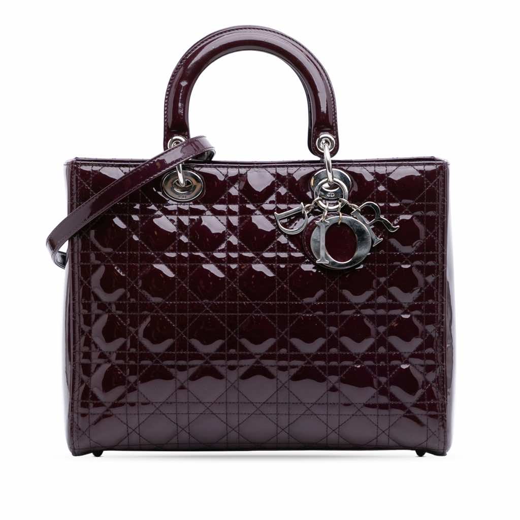 The Lady Dior features a quilted patent leather body, rolled top handles, a detachable flat leather strap, a top zip closure, and an interior zip pocket.