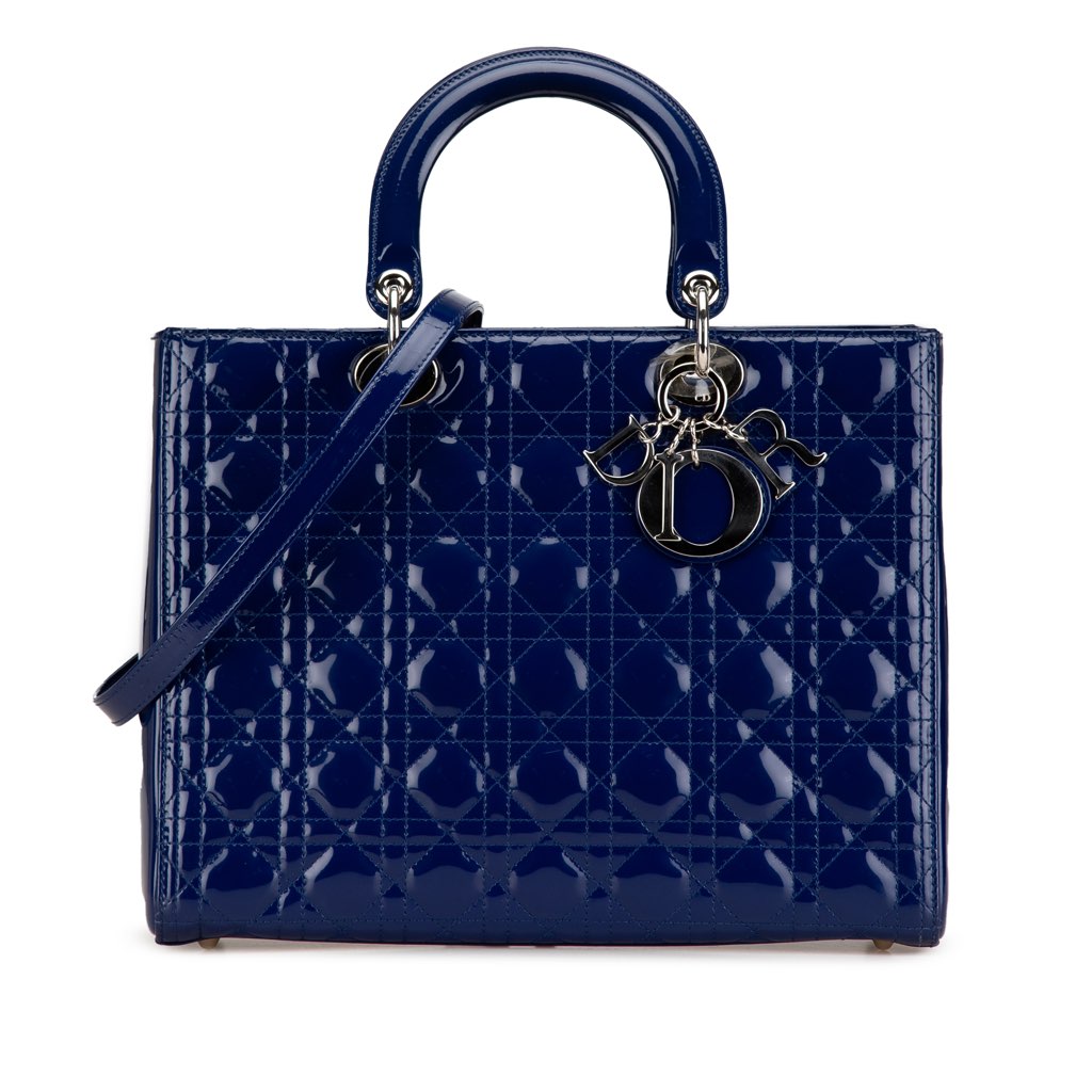 The Lady Dior features a quilted patent leather body, flat leather top handles, a detachable flat strap, a top zip closure, and an interior zip pocket.