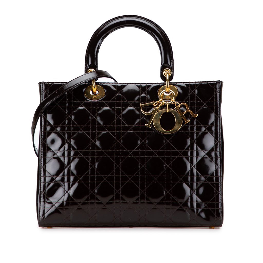 The Lady Dior features a patent leather body, flat leather handles, a detachable flat leather strap, a top zip closure, and an interior zip pocket.