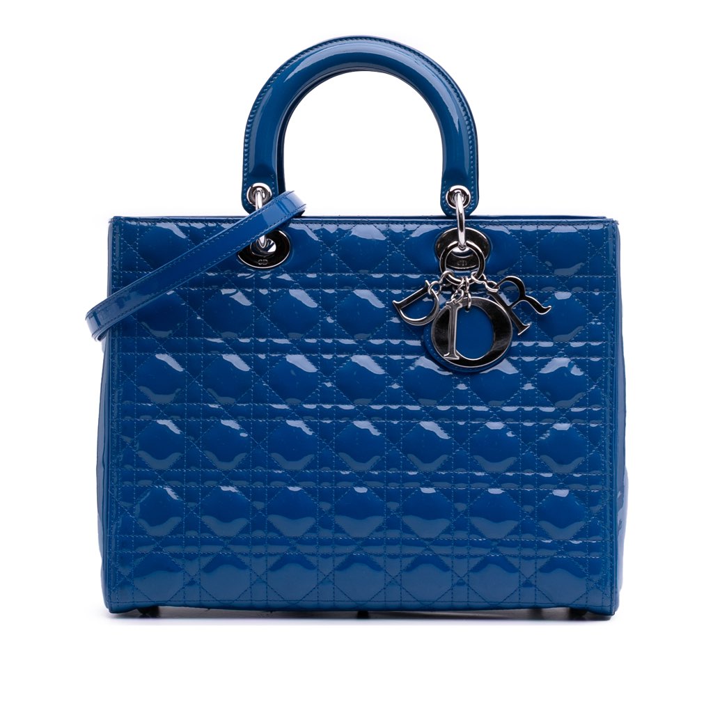 The Lady Dior features a quilted patent leather body, flat leather top handles, a detachable flat leather strap, a top zip closure, and an interior zip pocket.