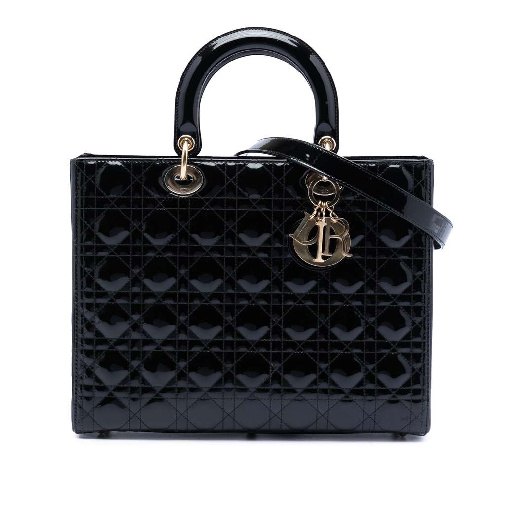 The Lady Dior features a quilted patent leather body, flat leather top handles, a detachable flat strap, a top zip closure, and an interior zip pocket.