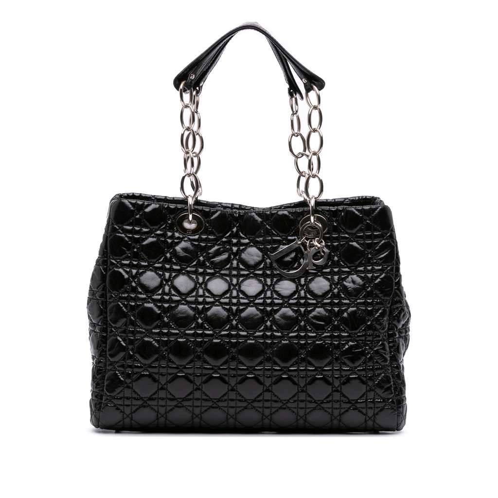 This tote features a quilted patent leather body, silver-tone chain link shoulder straps with leather guard, an open top with magnetic snap closure, and interior zip and slip pockets and zip compartment.