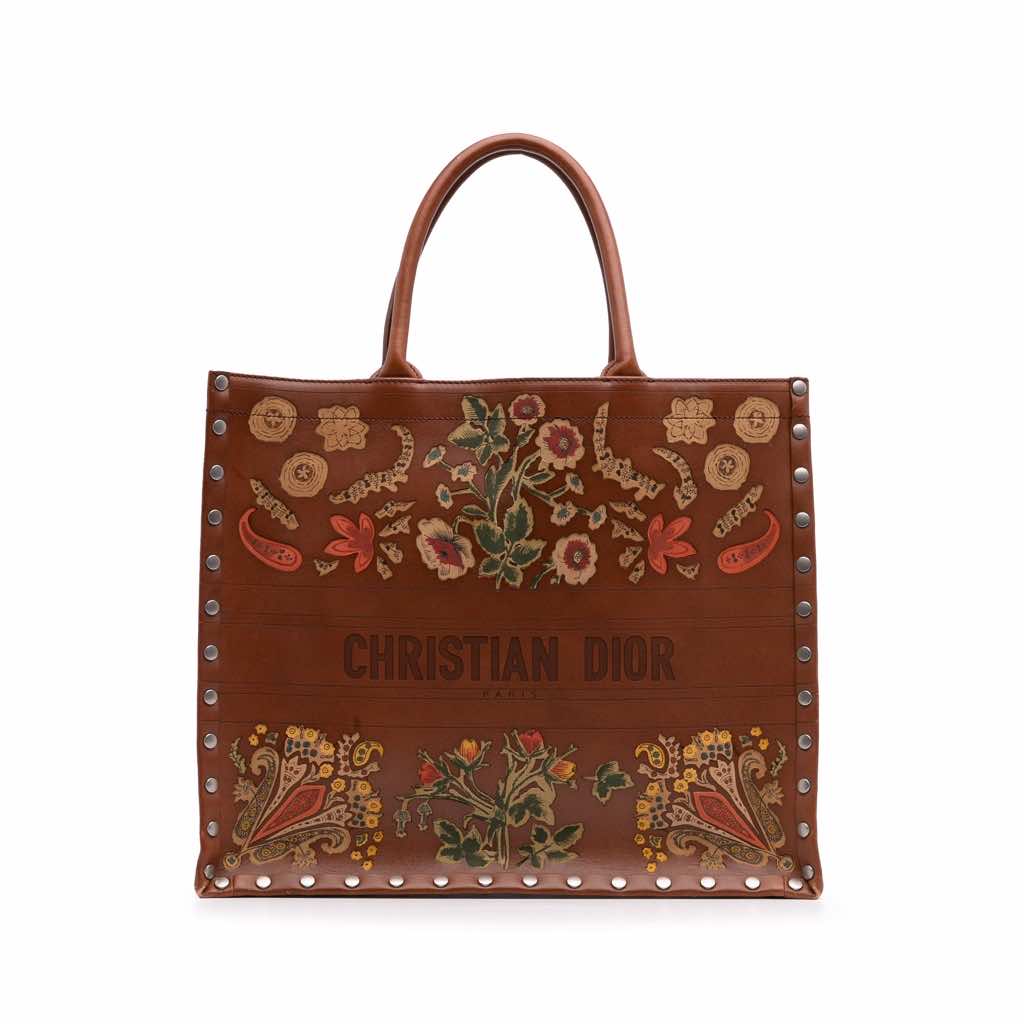 The Book Tote features an embroidered and studded leather body, rolled leather handles, and an open top.
