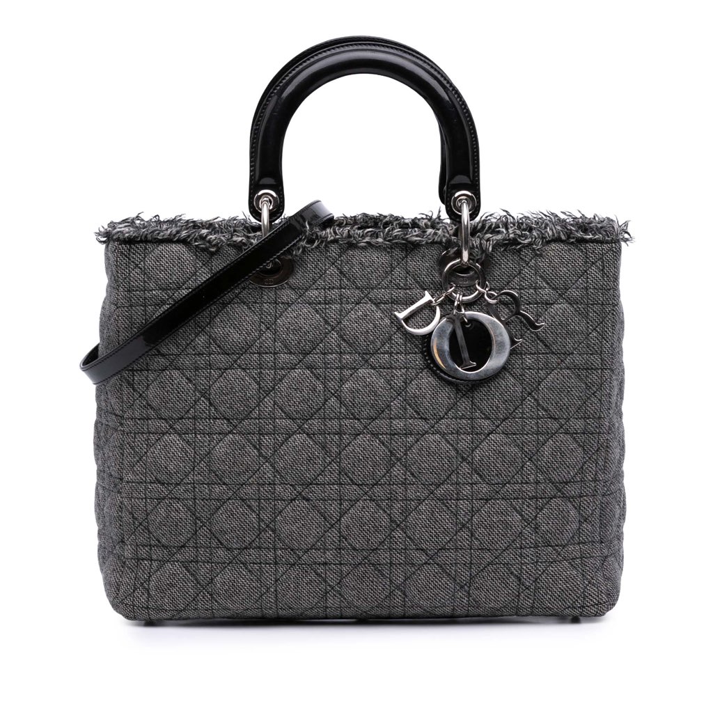 The Lady Dior features a quilted tweed body, flat top patent handles, a detachable flat patent strap, a top zip closure, and an interior zip pocket.
