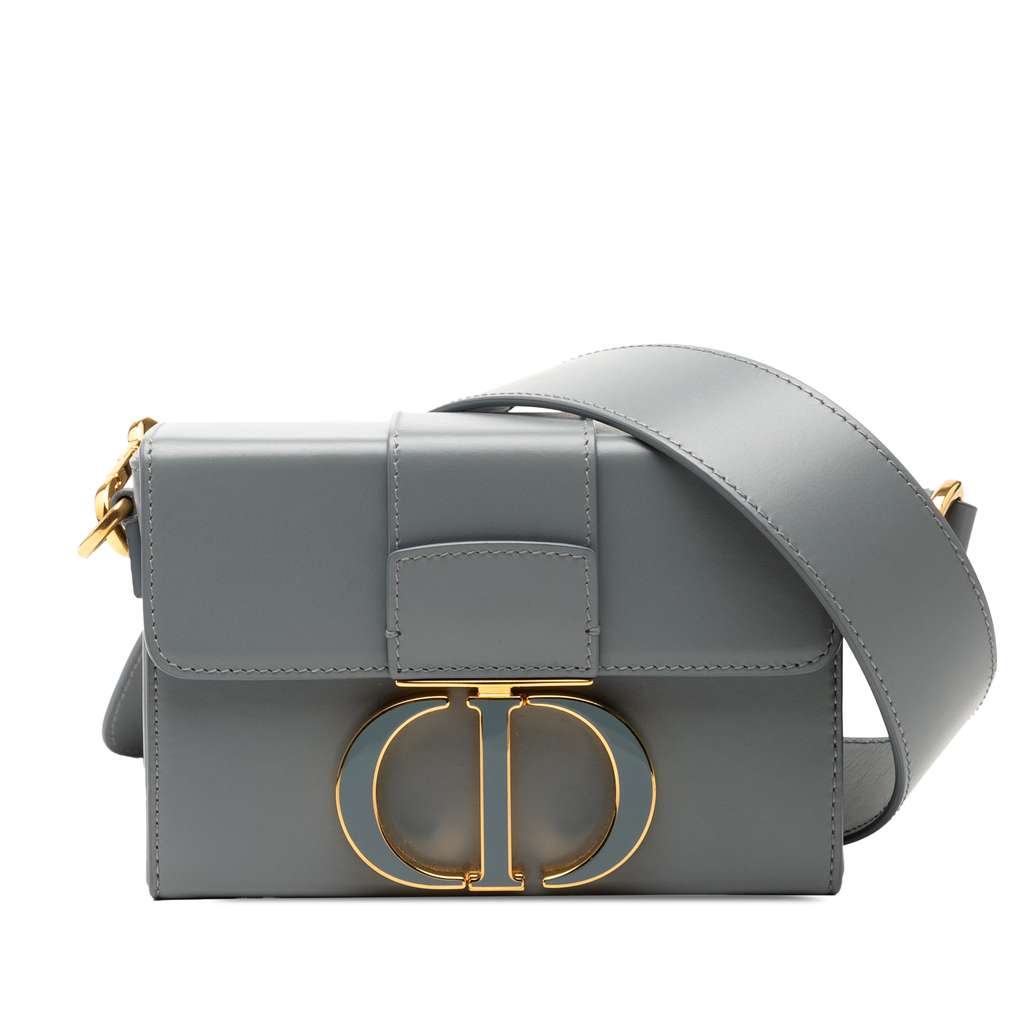 The 30 Montaigne features a leather body, a flat leather shoulder strap, a push lock closure, an exterior back slip pocket, and an interior slip pocket.