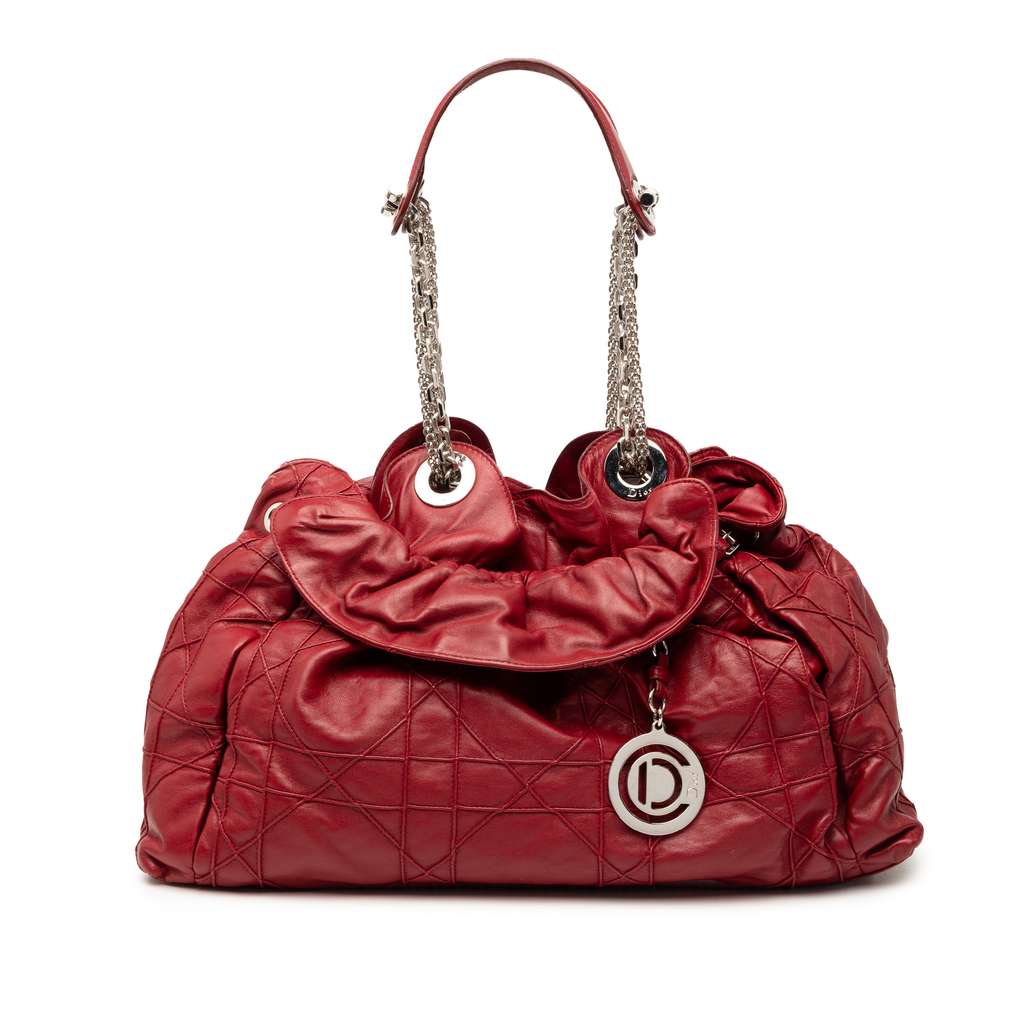 The Le Trente features a quilted leather body, chain shoulder straps with leather guard, an open top with magnetic snap closure, and an interior zip pocket.