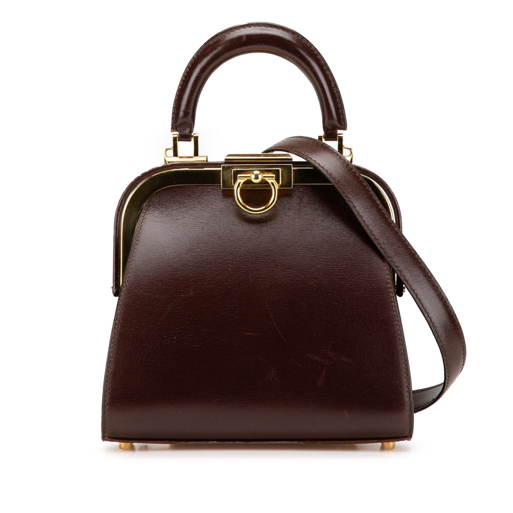 This satchel features a leather body, a rolled top handle, a detachable flat leather strap, a top clasp with twist lock closure, and an interior zip pocket.