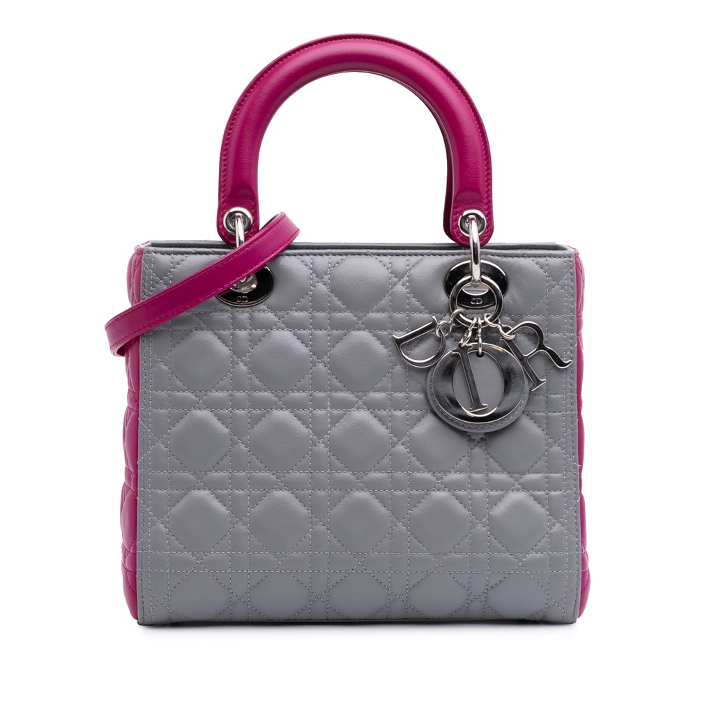 The Lady Dior features a quilted lambskin leather body, flat leather top handles, a detachable flat leather shoulder strap, a top zip closure, and an interior zip pocket.