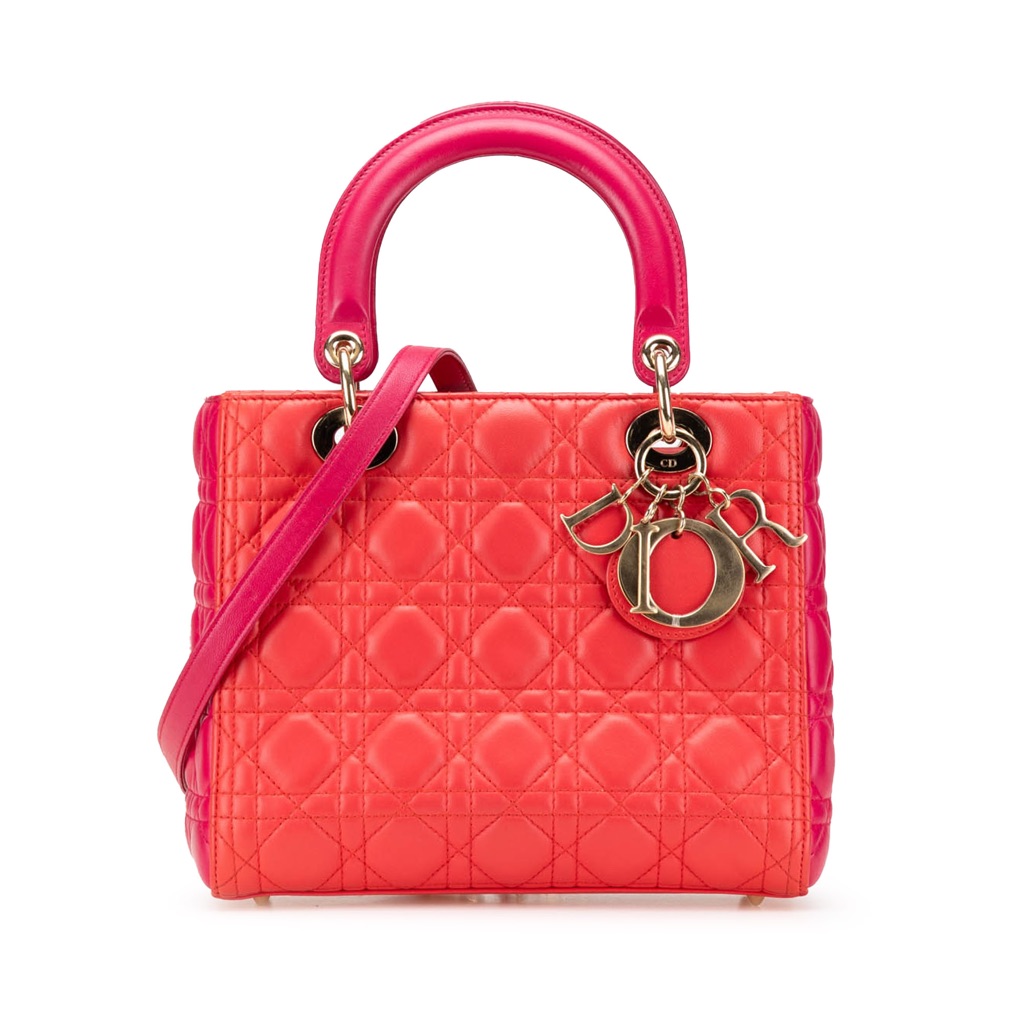 The Lady Dior features a quilted lambskin leather body, flat leather top handles, a detachable flat leather strap, a top zip closure, and an interior zip pocket.
