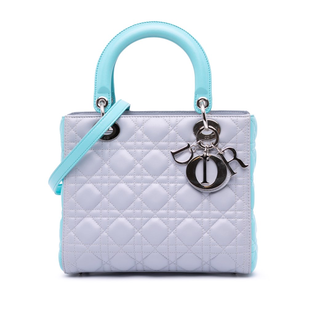 The Lady Dior features a quilted lambskin leather body, flat leather top handles, a detachable flat leather shoulder strap, a top zip closure, and an interior zip pocket.