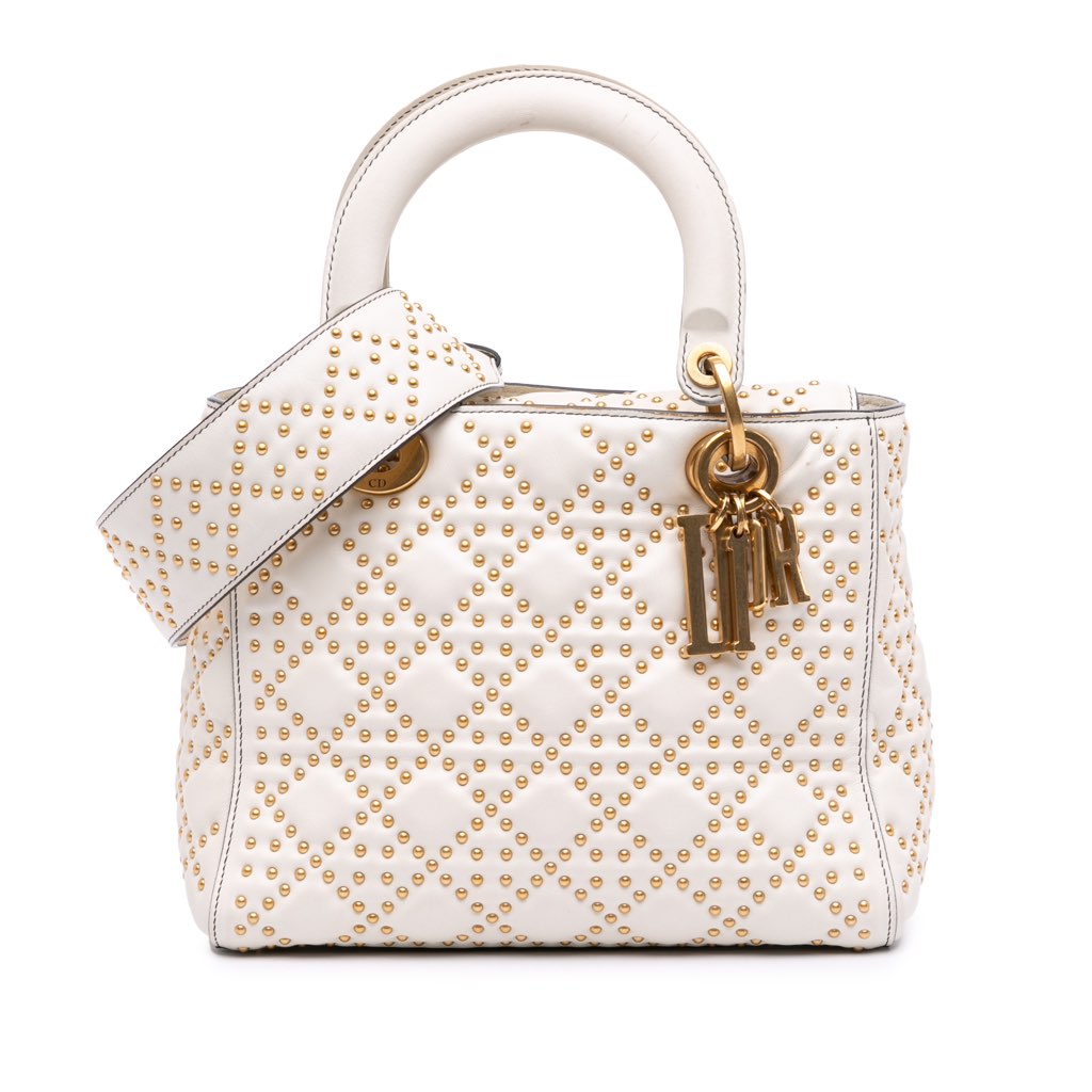 The Lady Dior satchel features a studded leather body, flat leather handles, a detachable flat studded leather strap, a studded fold-in flap closure, and interior zip and slip pockets.