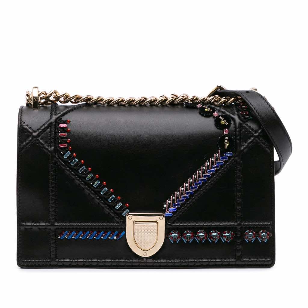 The Medium Diorama Flap bag features an embroidered leather body, a curb chain shoulder strap, a front flap with a push lock closure, and interior zip and slip pockets.