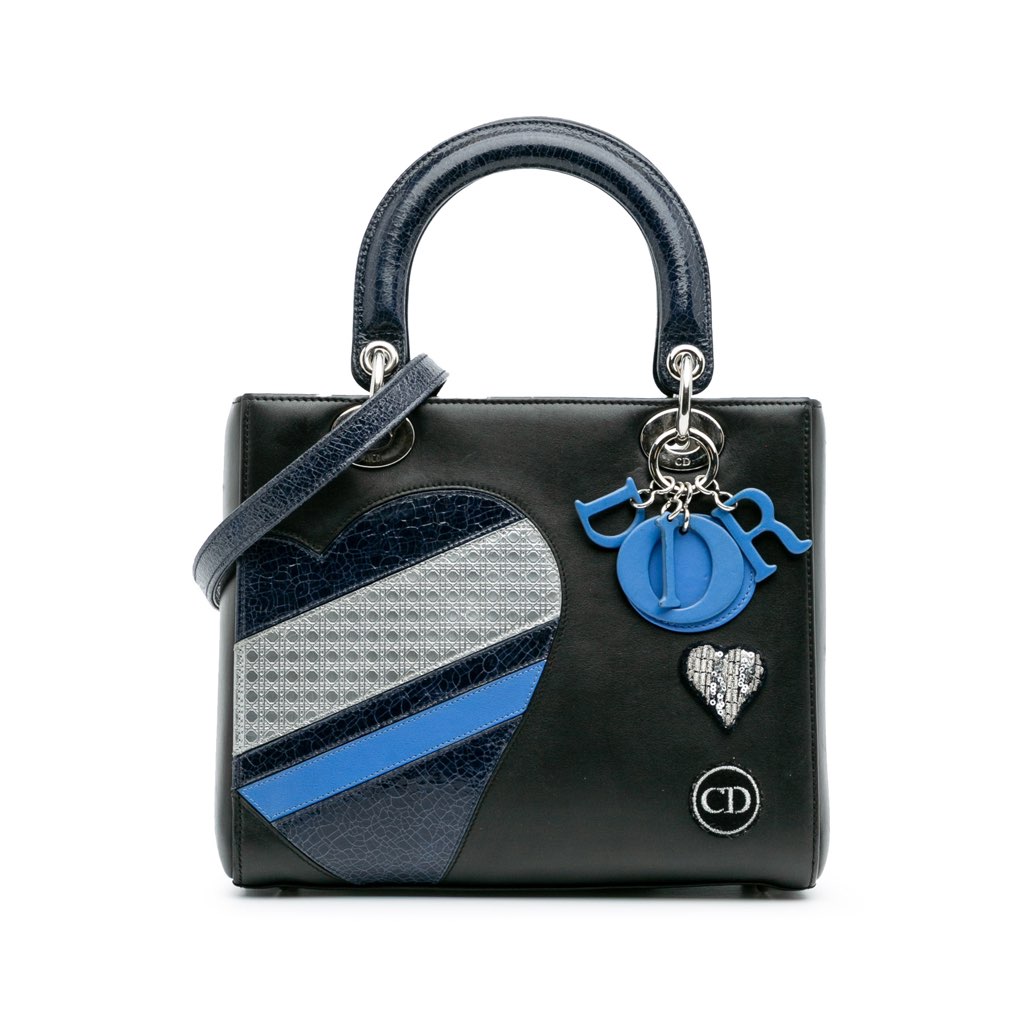 The Lady Dior features a calf leather body, structured patent leather handles, a detachable flat leather strap, a top zip closure, and an interior zip pocket.