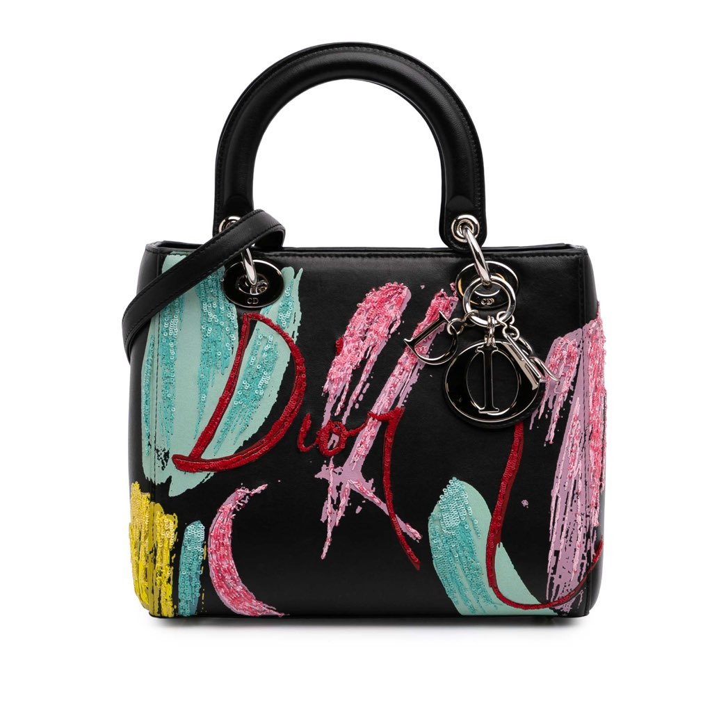 The Lady Dior features an embellished leather body, flat leather top handles, a detachable flat leather strap, a top zip closure, and an interior zip pocket.