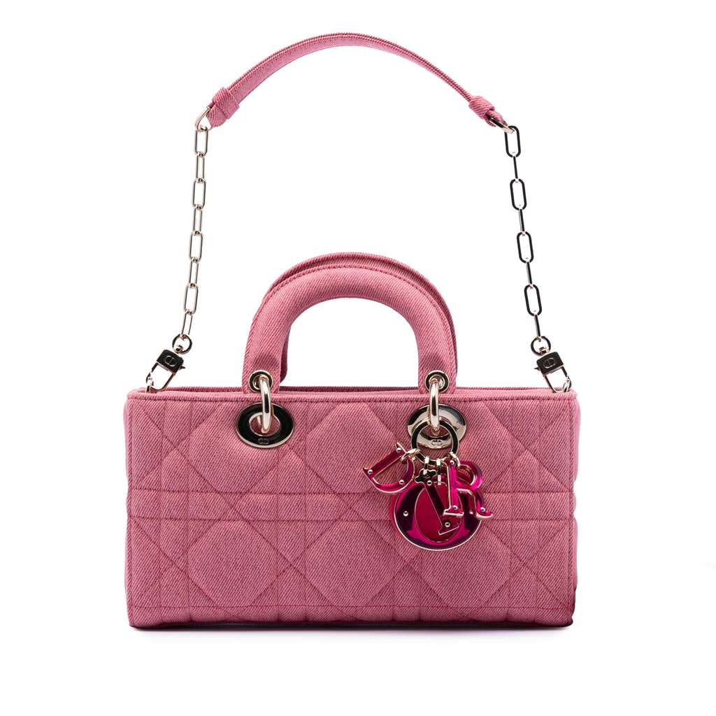 The Lady D-Joy features a quilted denim body, flat denim top handles, a detachable chain link and flat denim strap, a fold-in flap closure, and an interior slip pocket.
