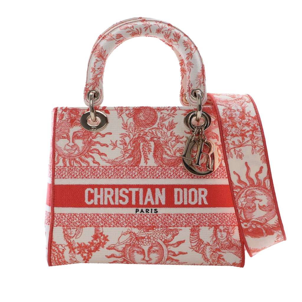 The Lady D-Lite features an embroidered canvas body, flat canvas handles, a detachable strap, a top flap closure, and interior zip and slip pockets.