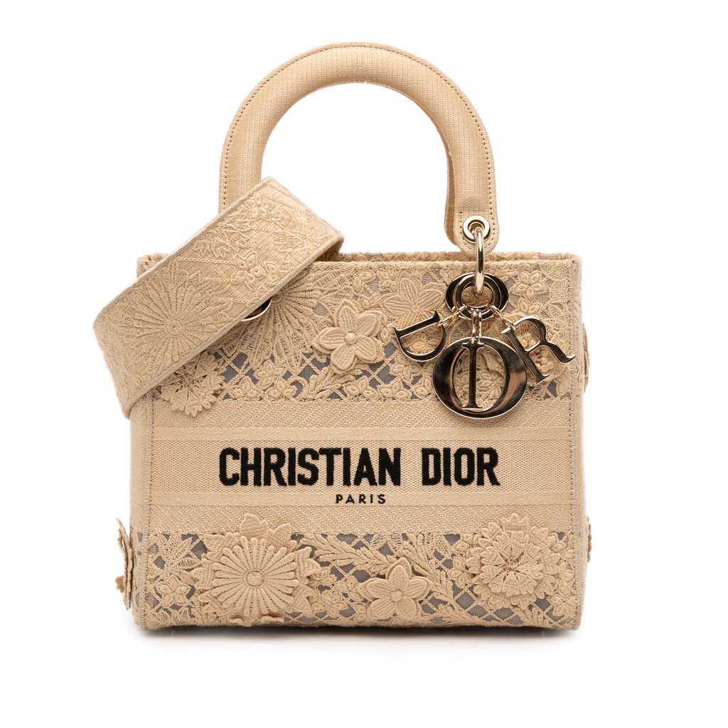 The Lady D-Lite features an embroidered lace body, structured top handles, a detachable flat strap, a top fold in flap closure, and interior zip and slip pockets.