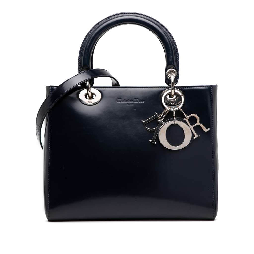 The Lady Dior satchel features a leather body, flat leather handles, flat removable leather strap, a top zip closure, and an interior zip pocket.