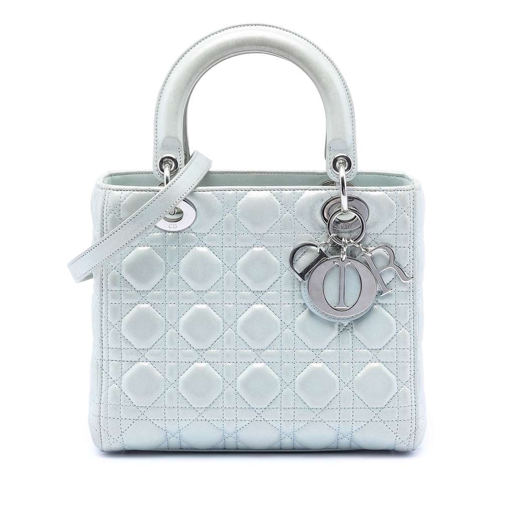The Lady Dior features a quilted iridescent lambskin leather body, flat leather top handles, a detachable leather strap, a top zip closure, and an interior zip pocket.