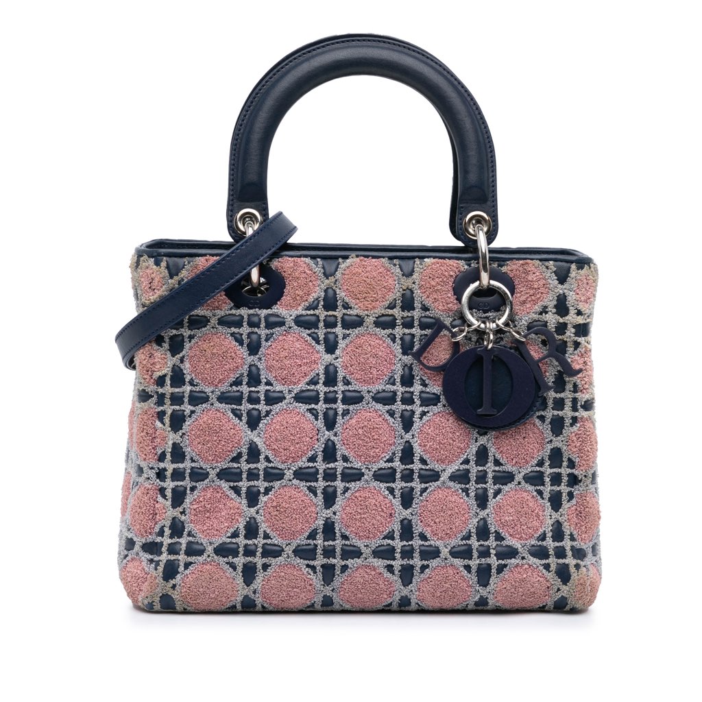 The Lady Dior features a quilted lambskin leather and tweed body, flat leather top handles, a detachable flat leather strap, a top zip closure, and an interior zip pocket.