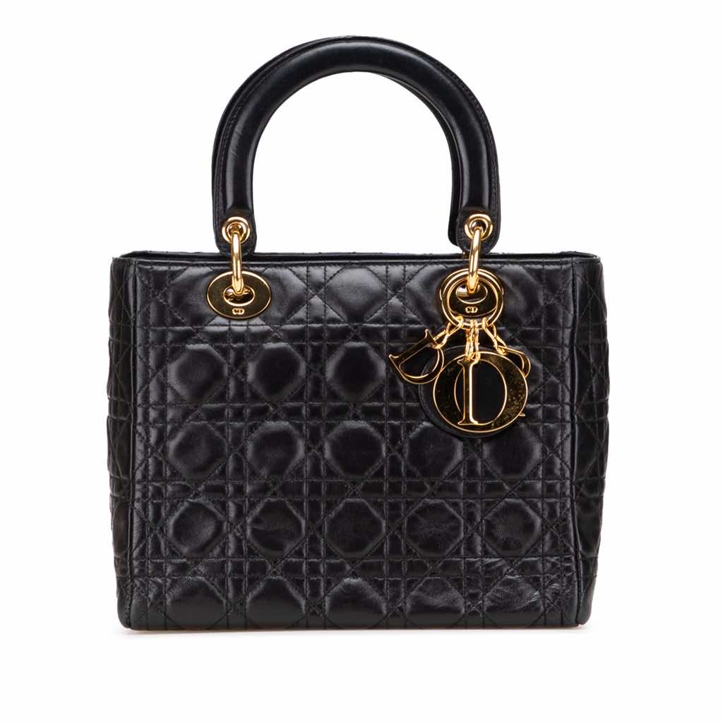 The Lady Dior features a quilted lambskin leather body, flat leather top handles, a top zip closure, and an interior zip pocket.