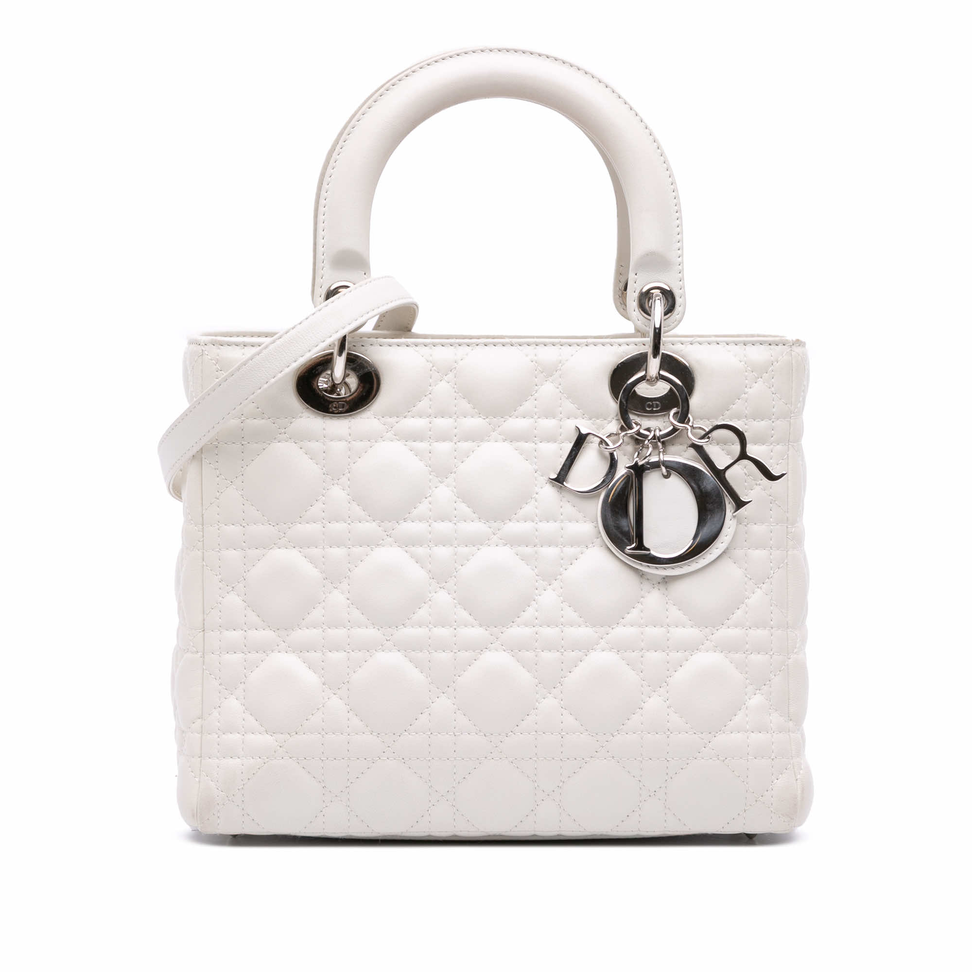 The Lady Dior features a quilted leather body, flat top handles, a detachable flat leather strap, a top zip closure, and an interior zip pocket.