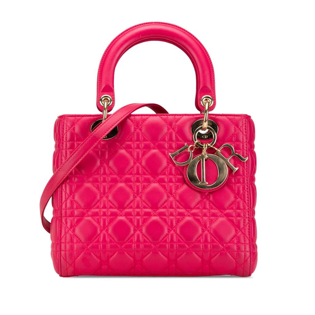 The Lady Dior features a quilted lambskin leather body, flat leather top handles, a detachable flat leather strap, a top zip closure, and an interior zip pocket.
