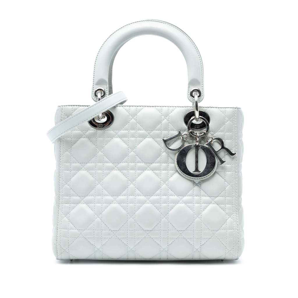 The Lady Dior features a quilted leather body, flat top handles, a detachable flat leather shoulder strap, a top zip closure, and an interior zip pocket.