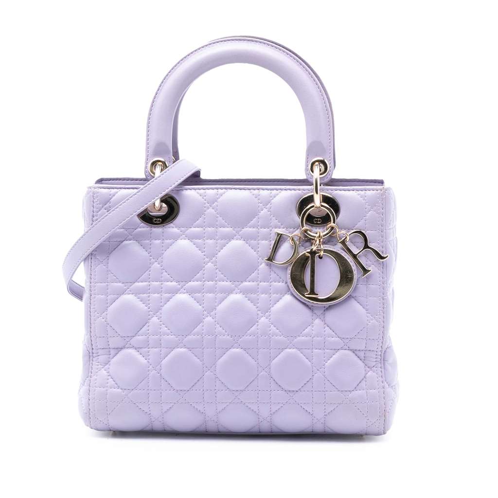 The Lady Dior features a quilted leather body, flat leather handles, a detachable strap, a top zip closure, and an interior zip pocket.