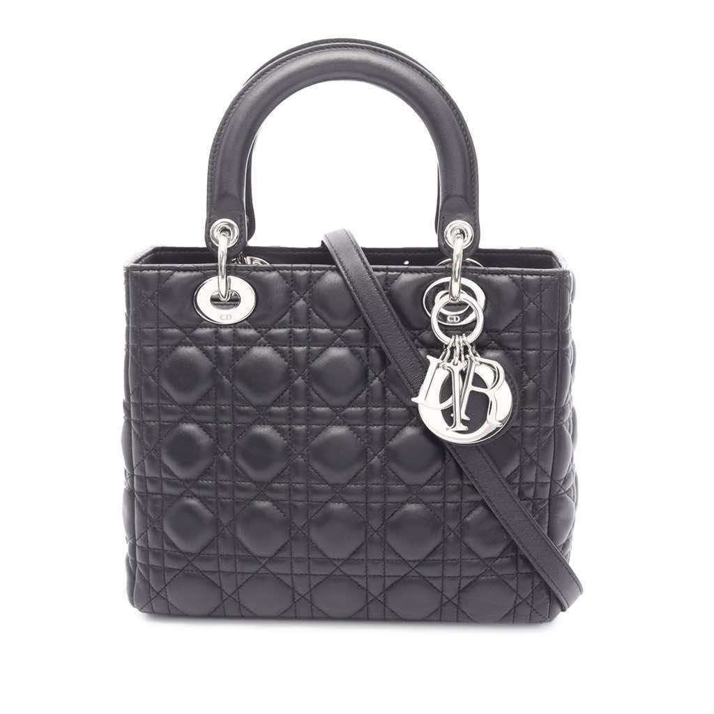 The Lady Dior features a quilted lambskin leather body, silver-tone hardware, flat leather top handles, a detachable shoulder strap, a top zip closure, and an interior zip pocket.