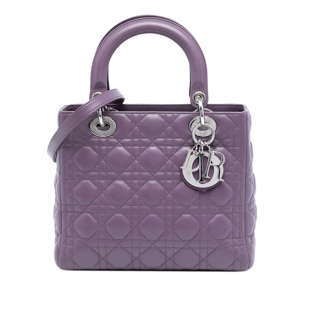 The Lady Dior features a quilted leather body, flat leather handles, a detachable strap, a top zip closure, and an interior zip pocket.