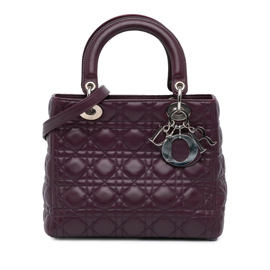 The Lady Dior features a quilted leather body, flat top handles, a detachable flat leather strap, a top zip closure, and an interior zip pocket.