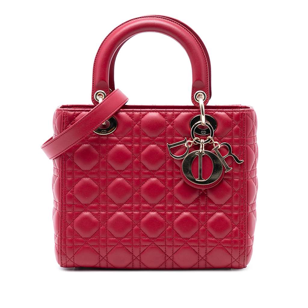The Lady Dior features a quilted lambskin leather body, flat leather top handles, a detachable flat leather strap, a top zip closure, and an interior zip pocket. Exterior corners has been repainted.