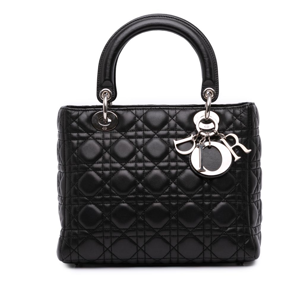 The Lady Dior features a quilted lambskin leather body, flat leather top handles, a top zip closure, and an interior zip pocket. Exterior bottom has been repainted.